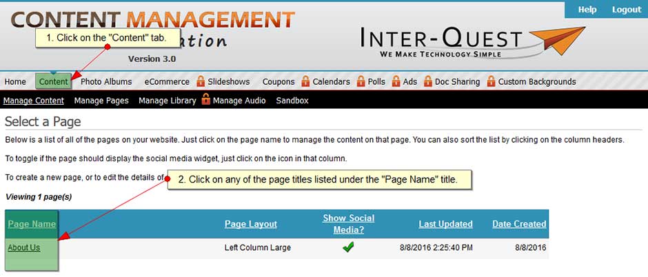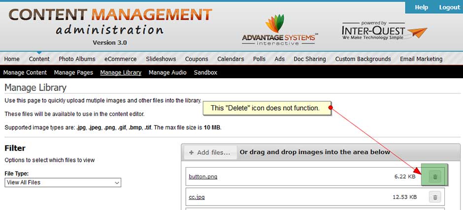 The "Manage Library" tab is used to quickly upload multiple images and other files into the library. Once uploaded, these files are available to use in the content editor.