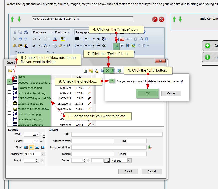 You do have the option to remove unwanted files within your website using the html editor (the tool you use to add/edit the content on the website pages). Please use the directions below to delete an unwanted image.