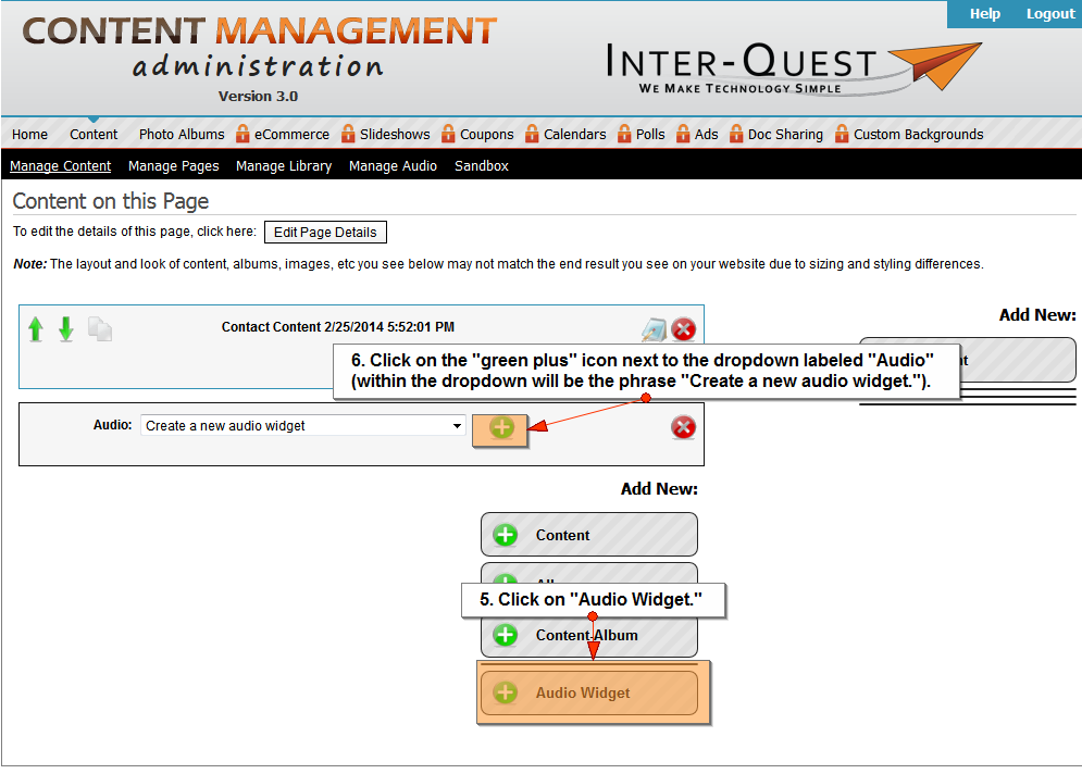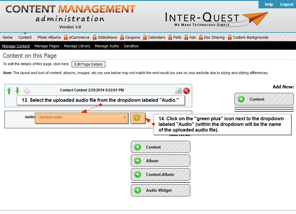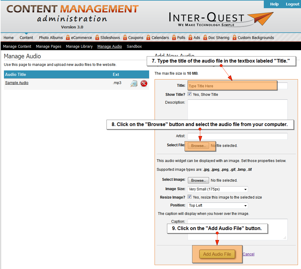 icon next to the dropdown labeled "Audio" (within the dropdown will be the name of the uploaded audio file).