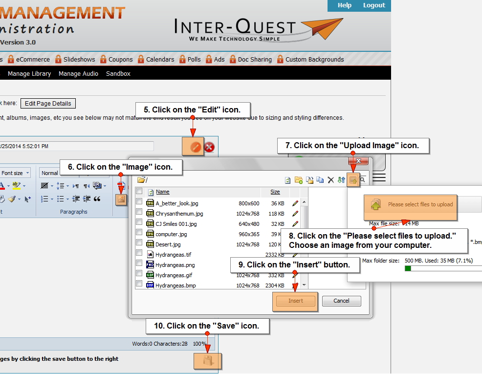 - Click on the phrase"Please select files to upload." Choose an image file from your computer.