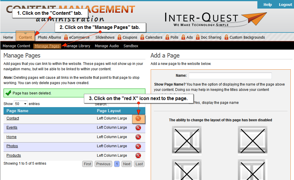 Note: Deleting pages will cause all links in the website that point to that page to stop working. You can only delete pages you have created.